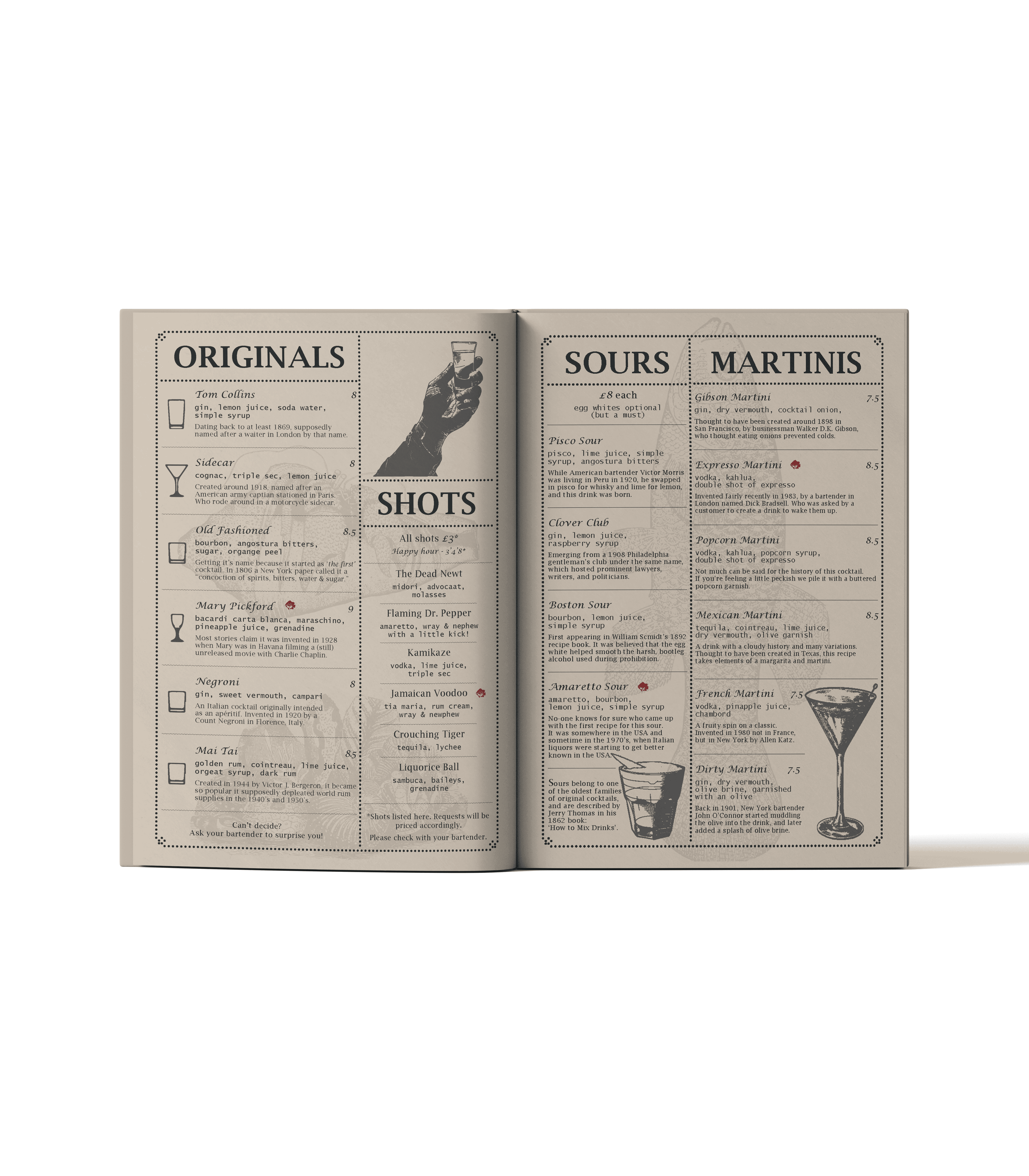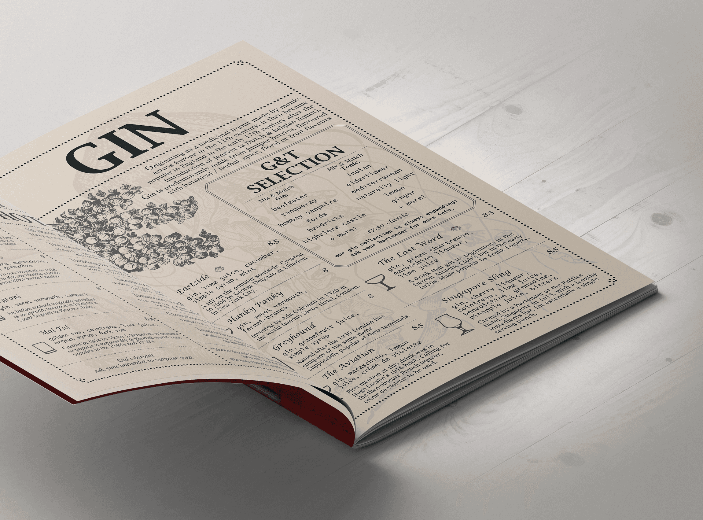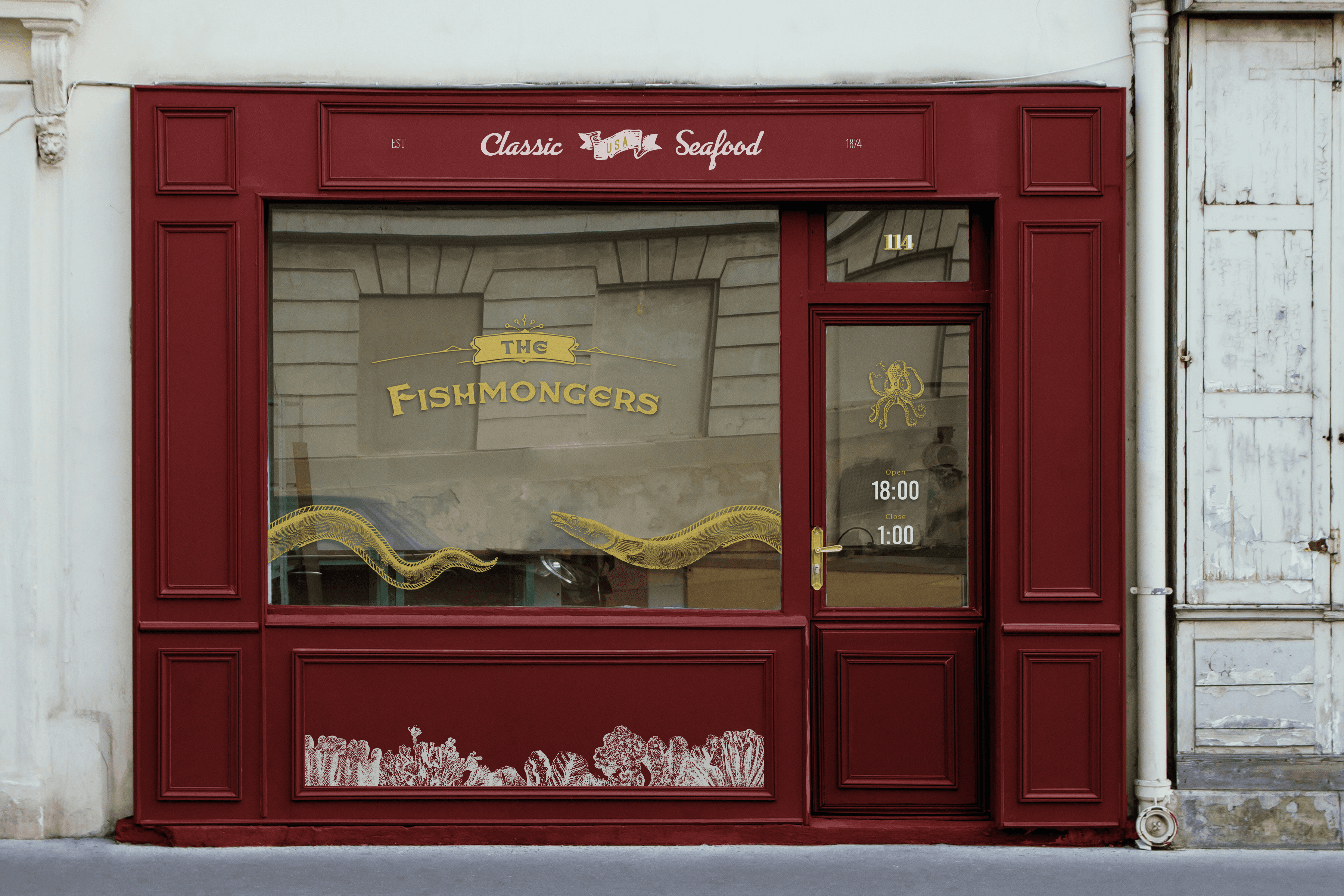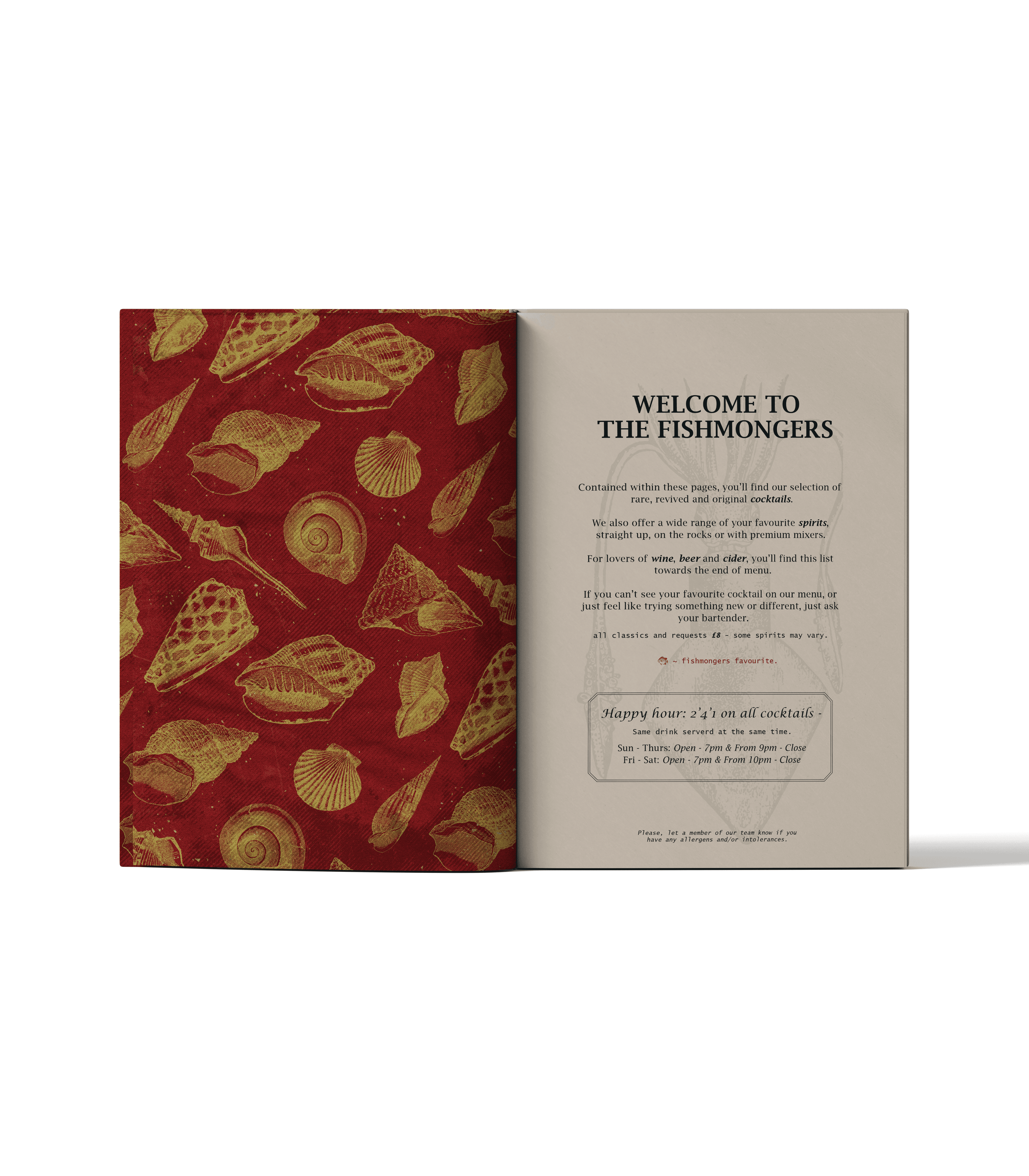 A self initiated concept for a hidden cocktail bar behind a fishmonger storefront, inspired by Victorian nautical themes and deep sea folklore. The project included a full drinks and bar menu, using nautilus motifs, vintage typography, and textured print styles to create atmosphere and character. Designed as a creative experiment, the work balances immersive storytelling with clarity and usability, treating the brand as a fully realised hospitality concept.